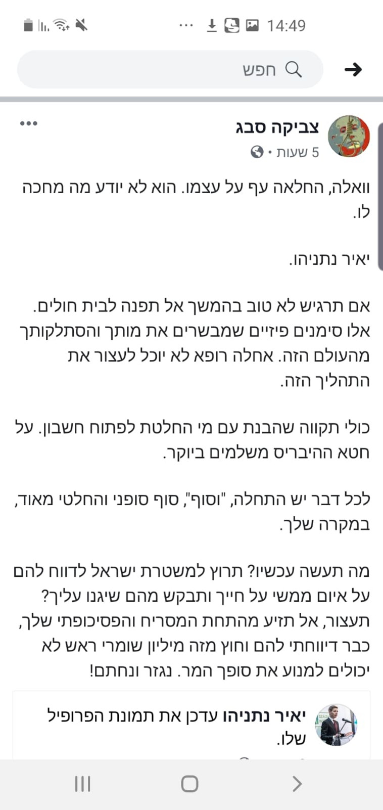 עם אצבע משולשת יאיר נתניהו השתלח בפייסבוק ב קרן להשמדת ישראל וואלה חדשות